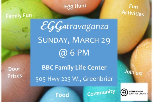 The week before Easter (March 29) we will have our Annual Eggstravaganza at 6 PM. It will be held in the large white metal building behind the main church (Family Life Center). We welcome our church families and families in our community to join us for this fun event. There...
